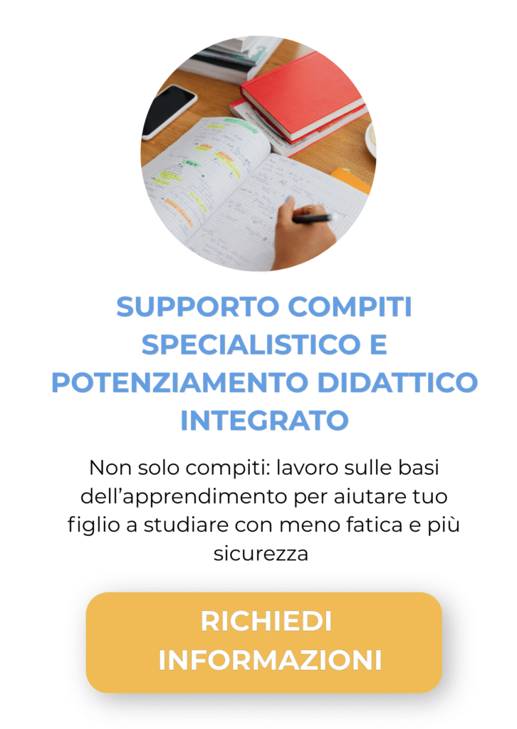 Il Supporto Compiti Specialistico e Potenziamento Didattico Integrato è un percorso individuale uno a uno, progettato per intervenire in modo mirato sulle difficoltà di apprendimento, partendo dalla loro reale origine.